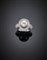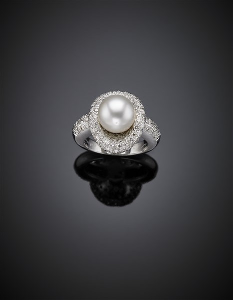 Anello in oro bianco rifinito con diamanti per complessivi ct. 1,20 circa e perla coltivata di mm 10,15 circa, g 13,10 circa misura 15/55.