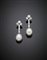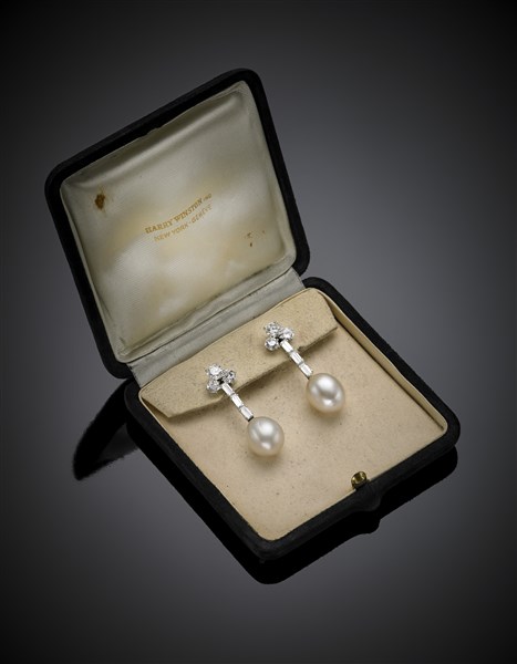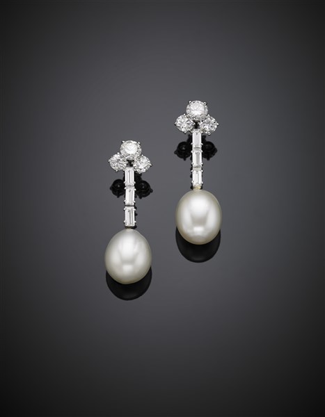Orecchini pendenti in platino e oro bianco con diamanti rotondi e baguette per complessivi ct. 4,70 circa a tenere due perle South Sea ovoidali di mm 12,70x15,70 circa, g 13,20 circa, lungh. cm 4,10 circa. Marchi francesi. In scatola firmata Harry Winston
