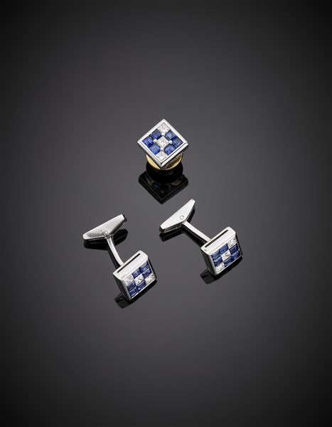 Gemelli e pin in oro bianco, zaffiri e diamanti carré. Stop in metallo, netti complessivi g 13,47 circa.
