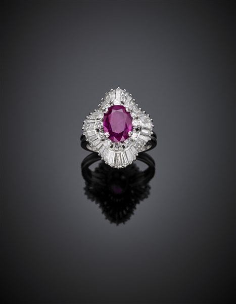 Anello in platino con rubino ovale di ct. 2,60 circa, diamanti rotondi e tapered per complessivi ct. 3 circa, g 12,00 circa misura 14/54. Marcato 889 AL.
