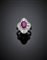 Anello in platino con rubino ovale di ct. 2,60 circa, diamanti rotondi e tapere