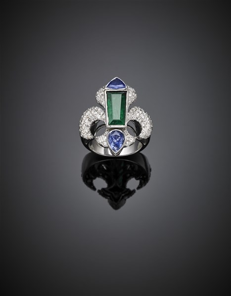 Anello a giglio in oro bianco, diamanti a pavè per complessivi ct. 1,20 circa, al centro uno smeraldo e due zaffiri forma fantasia, g 16,30 circa misura 16/56. In scatola di Percossi Papi (mancanze)