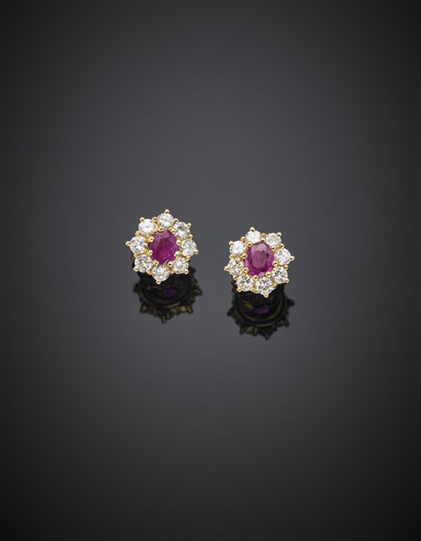 Yellow gold diamond and ruby cluster earrings, diamonds in all ct. 0.80 circa, g 4.50 circa, diam. cm 1.35 circa.