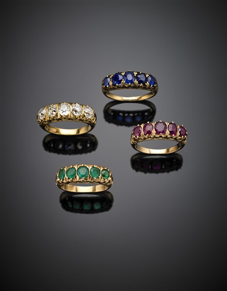 Lot of four yellow chiselled gold ring with sapphires in all ct. 2.50 circa, rubies in all ct. 2 circa, emeralds in all ct. 1.20 circa and old mine diamonds in all ct. 2.00 circa, one synthetic corundum, in all g 26.30 circa size 13/53. 15/55. In Chiaravalli case