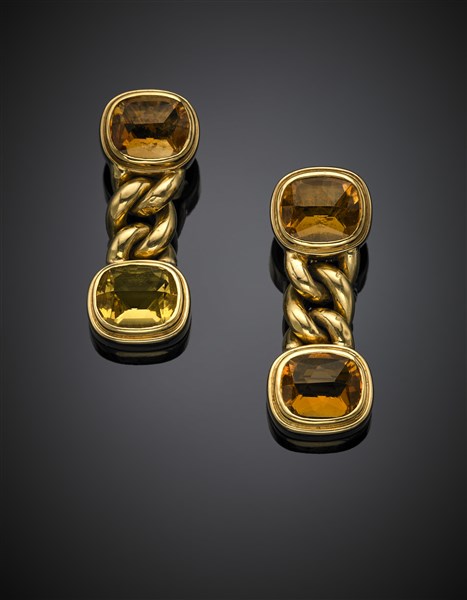 Lot 584 | Orecchini pendenti a maglia groumette in oro giallo con quarzi citrini a cuscin