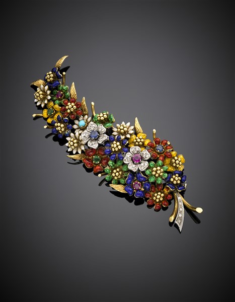 Broche floreale in oro bianco e giallo rifinita con diamanti, smalti policromi e gemme varie, g 35,20 circa, lungh. cm 9,80 circa. Marcato 160 AL. In scatola Chantecler (lievi difetti).