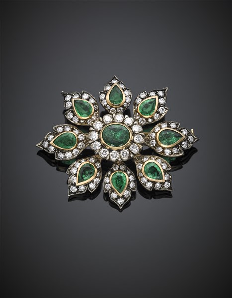 Spilla a fiore stilizzato in oro giallo e argento con diamanti rotondi per complessivi ct. 2,30 circa e smeraldi a goccia e ovale per complessivi ct. 3,00 circa, g 16,10 circa, lungh. cm 16,10, largh. cm 4,70 circa. In scatola Chiaravalli