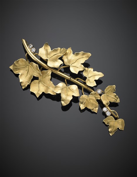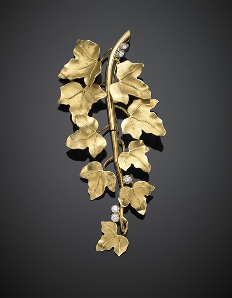Lot 618 | Spilla articolata a tralcio di edera in oro giallo in parte cesellato e diamant