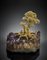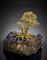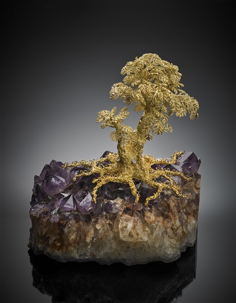 Albero in oro giallo cesellato rifinito in diamanti con due perni in metallo poggiante su base di quarzo, al netto della base g 737,50 circa, lungh. cm 29 circa. Con scatola originale
