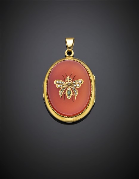 *Yellow gold and carnelian pendant locket with a rose cut diamond, paste and seed pearl insect, g 22.80 circa, length cm 5.30 circa. French hallmark. (losses)