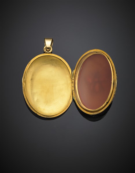 *Pendente portafoto in oro giallo, corniola e insetto in diamanti a mezza roset