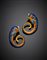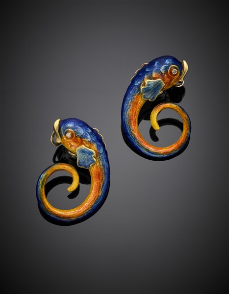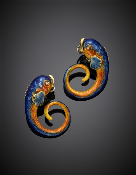 Orecchini a guisa di pesci in oro giallo e smalti policromi con accessori per i