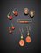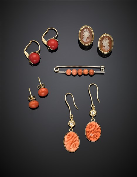 Lotto in oro bianco e giallo composto da due paia di orecchini con corallo, una spilla con boules di corallo, orecchini con vetri rossi e orecchini con cammei in corniola, complessivi g 18,60 circa.