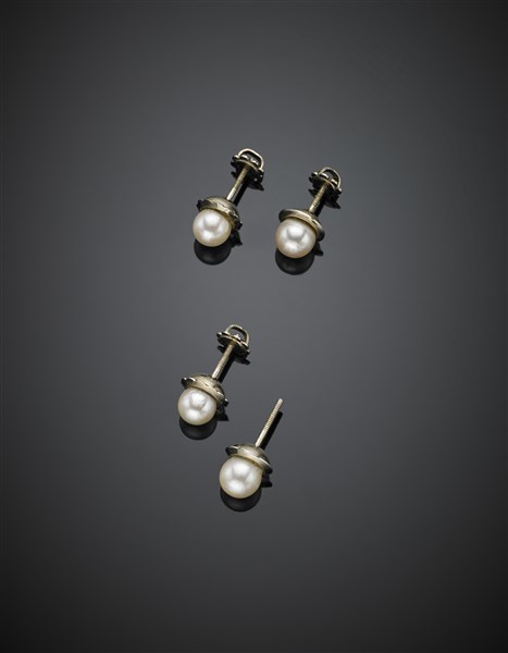 Two pairs of white gold cultured pearl earrings, pearl diam mm 7/7.50 circa, in all g 7.60 circa. (losses)