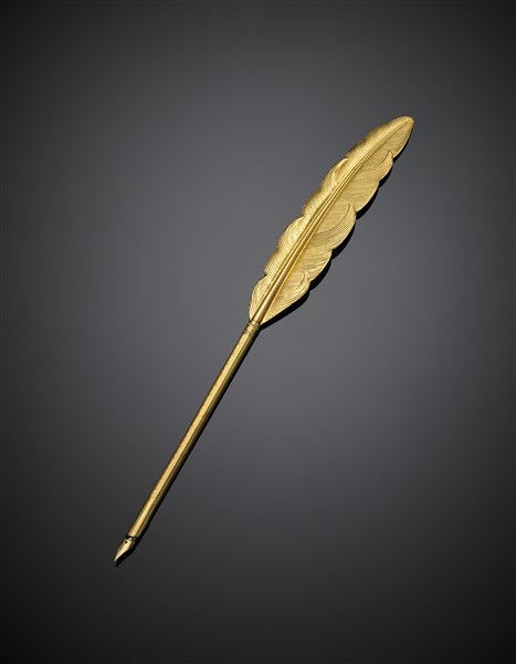 Penna in metallo dorato a guisa di piuma, con pennino,, lungh. cm 22,50 circa.
