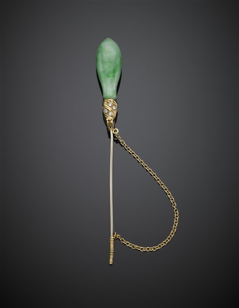 Spillone in oro giallo e giadeite rifinito con piccoli diamanti, g 10,60 circa, lungh. cm 10,40 circa.