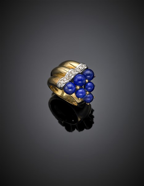 Anello in oro giallo e boules di lapis ricostituito, diamanti a rifinirlo, g 15