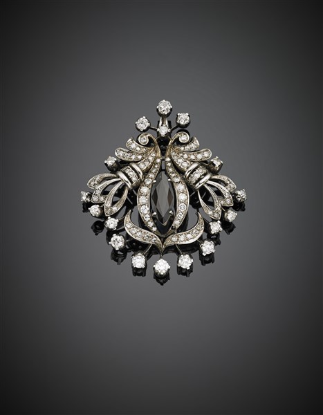 Round and single cut diamond ct. 2.30 circa marquise sapphire white gold brooch pendant, g 18.80 circa, length cm 5.90 circa. (losses).