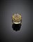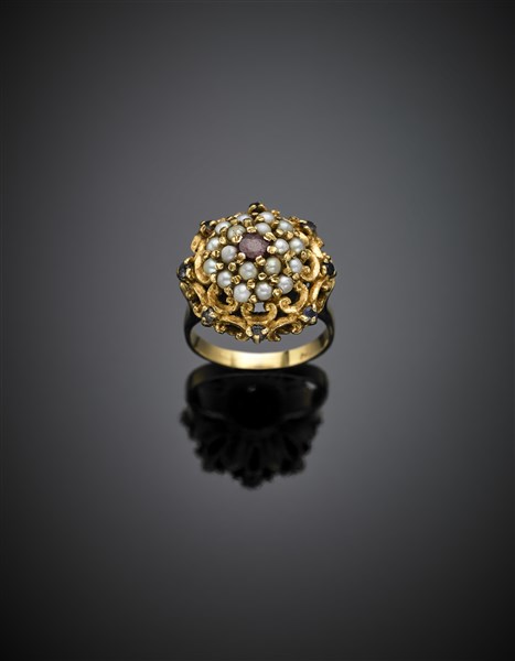 Anello a cupola in oro giallo, granato, microperle e pietre azzurre, g 9,20 cir