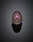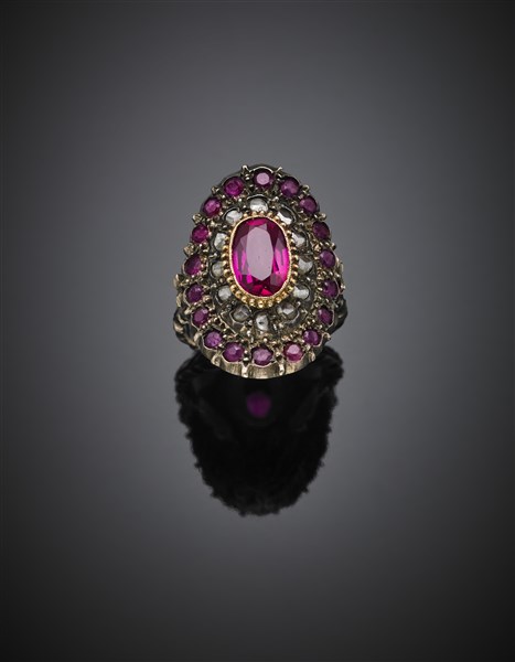 Anello in oro e argento con diamanti e rubini, al centro un rubino sintetico, g