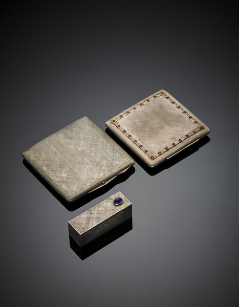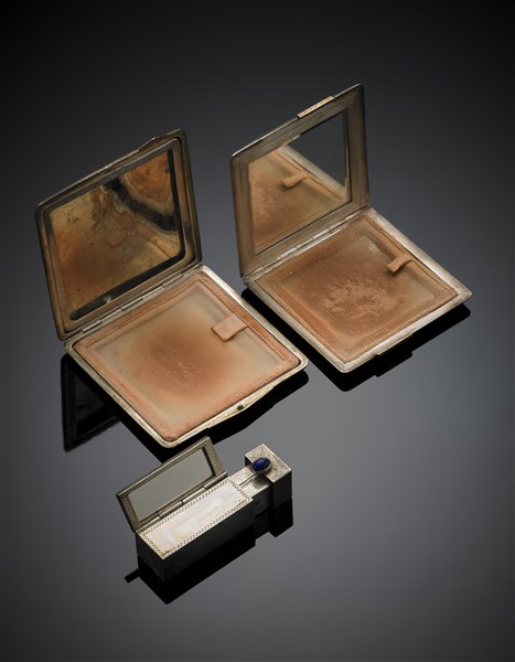 Lotto composto da un portacipria in argento 925/1000 con inserti in oro giallo e rubini firmato Gucci, un portacipria e un portarossetto in argento 800/1000, complessivi lordi g 221,90 circa. (difetti e mancanze)