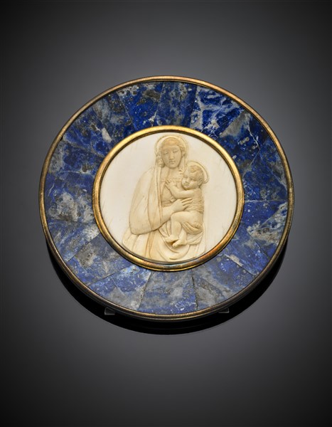 CHIAPPE Madonna con Bambino in osso con cornice rotonda in lapislazzuli e argen
