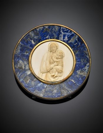 Madonna con Bambino in osso con cornice rotonda in lapislazzuli e argento dorato, sul retro la data 14-V-942, g 140,25 circa, diam. cm 10,50 circa. Firmata e marcata con il Fascio F.Chiappe, 244 MI. In scatola di F. Chiappe Genova - Milano