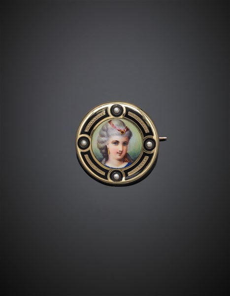 *Spilla in oro giallo 333/1000 con miniatura, smalto nero e microperle, g 5,10 circa, diam. cm 3 circa. (difetti)