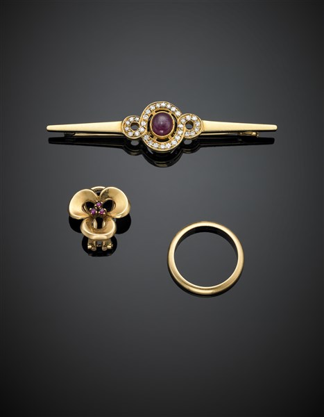 Yellow gold lot comprising a clover earclip, a cabochon ruby and diamond bar brooch and a wedding band, in all g 12 circa.