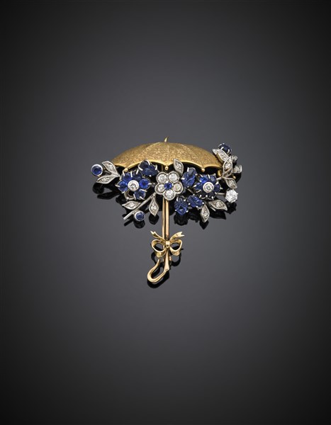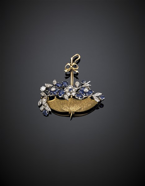 Spilla/pendente in oro giallo e bianco cesellato a guisa di ombrello con fiori in diamanti e zaffiri scolpiti, g 7,40 circa, lungh. cm 3,60 circa. (mancanze)