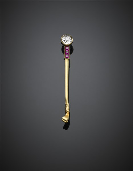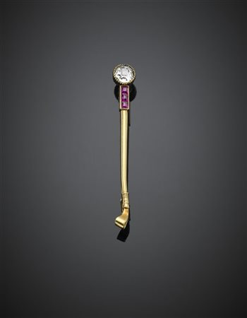 Spillone a guisa di frustino in oro giallo con diamante di ct. 0,60 circa e rubini, g 3,70 circa, lungh. cm 5,40 circa.
