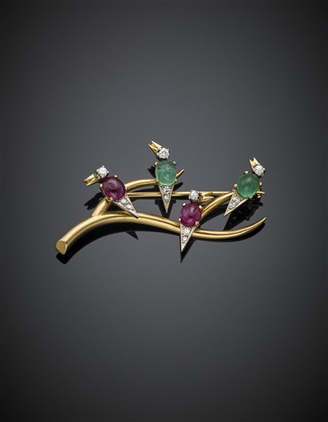 Broche in oro giallo a ramoscello con uccellini in diamanti, smeraldi e rubini, dettagli in oro bianco, g 9,40 circa, lungh. cm 5 circa.
