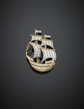Spilla a guisa di veliero in oro giallo e bianco con diamanti rotondi per compl