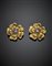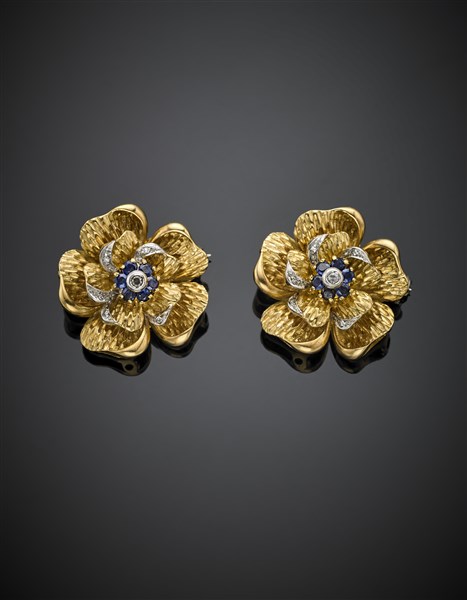 Coppia di spille a fiore in oro giallo e bianco con diamanti e zaffiri, comples