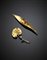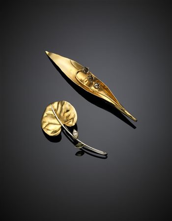 Lot of two bi-coloured gold gold floral brooches of cm 12 and cm 8 circa, one accented with green stone, the other with a vitreous paste, in all g 23.80 circa. Both signed De Regibus, 608 AL.