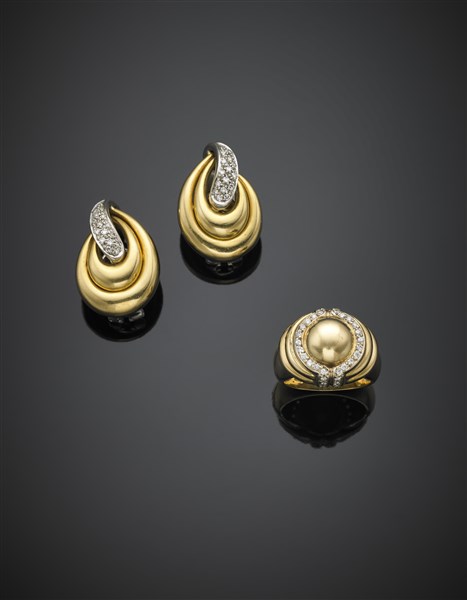 Lotto in oro giallo, bianco e diamanti composto da anello e orecchini, compless