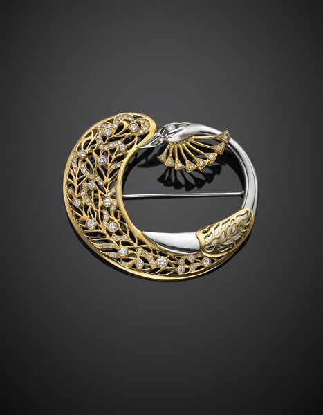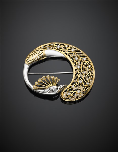 Spilla a guisa di pavone in oro giallo, bianco e diamanti, g 25 circa, largh. cm 6 circa. Firmata e marcata Alvestile, 927 MI.