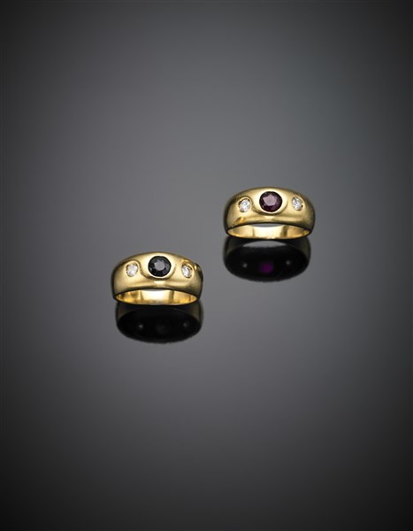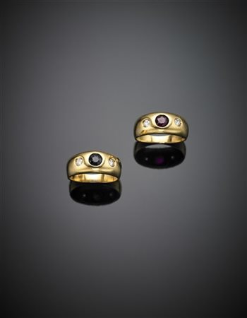 Coppia di anelli in oro giallo con zaffiro, rubino e diamanti, complessivi g 7,10 circa misura 7/47.