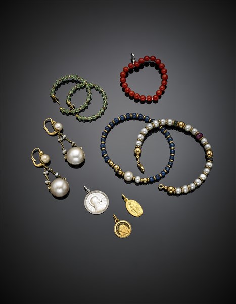 Lot comprising two yellow gold pearl and gem elastic bracelets of which one signed Le.Gi., pearl, diamond and mabé pearl yellow gold pendant earrings, green paste hoop earrings with gold clasps, white gold coral heart pendant and three gold medals, in all gross g 50.50 circa. (slight defects)