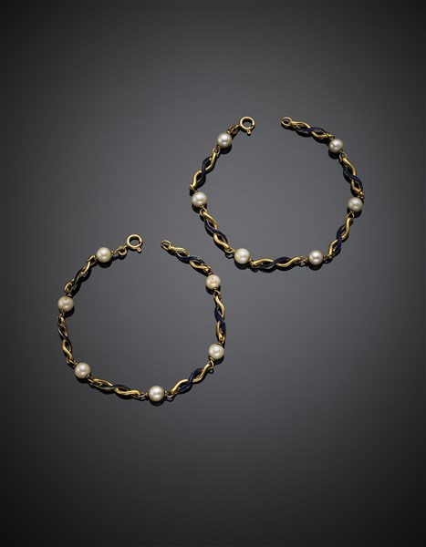 Pair of yellow gold, pearl and blue enamel bracelet, in all g 20.30 circa. Marked 1 AR. (defects)