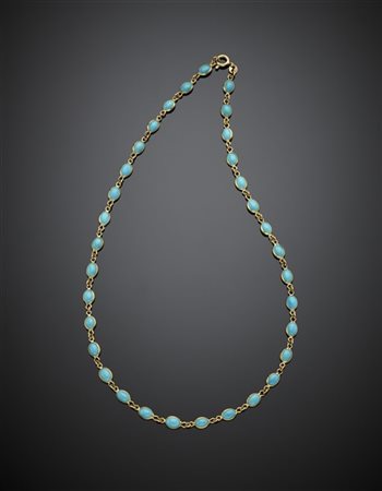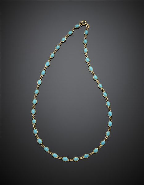 Catenina in oro giallo con turchesi ovali, g 8,50 circa, lungh. cm 40,5 circa.
