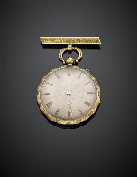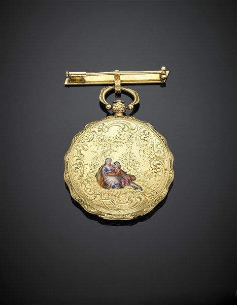 Yellow chiselled gold brooch and pendant pocket watch key-movement, enamel miniature on the case, g 32.15 circa, diam. cm 3.80 circa. Marked inside Courvoisier, swiss hallmarks.