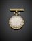 Spilla con orologio da tasca pendente in oro giallo cesellato con carica a chiavetta, sulla cassa miniatura in smalti, g 32,15 circa, diam. cm 3,80 circa. Marcato all'interno Courvoisier, n°551, marchi svizzeri.