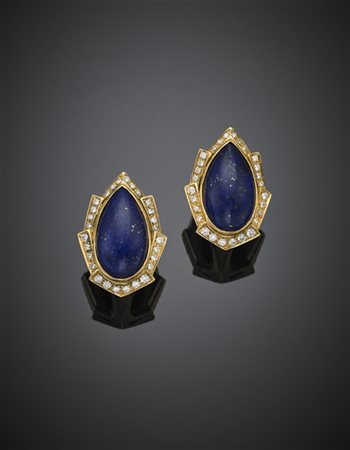 Pear shape cabochon lapis and diamond yellow gold earclips, g 21.70 circa, length cm 3 circa. Marked 927 MI.