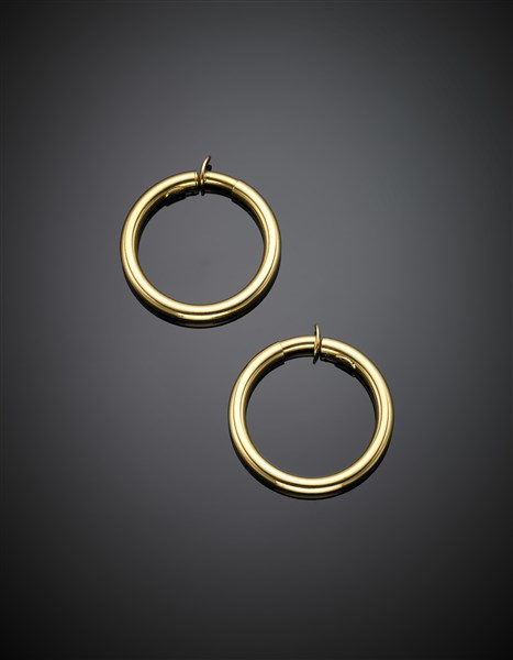 Orecchini ad anella in oro giallo, g 13,50 circa, diam. cm 3,60 circa. Marcati
