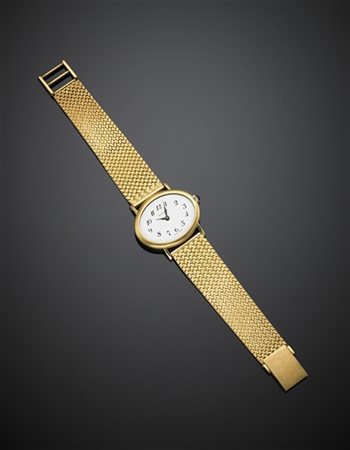 Yellow gold lady's wristwatch with bracelet, cabochon sapphire on the crown, case n° 779933, g 47.40 circa, length cm 17.70 circa. Swiss and italian hallmarks. With original case (losses)