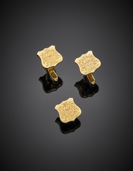 Gemelli e spilla in oro giallo con stemma inciso, stop in metallo, netti complessivi g 35,65 circa. Marcati 948 MI.
