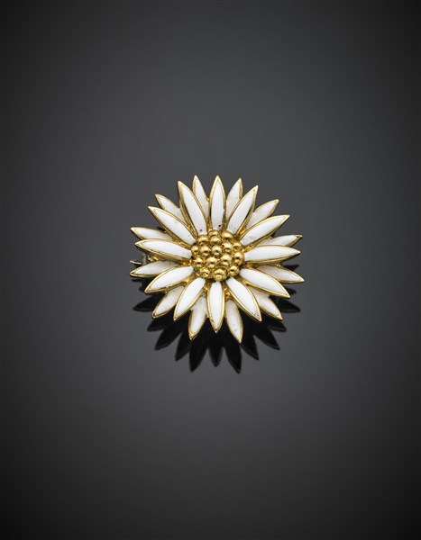 Yellow gold and white enamel daisy brooch, g 5.20 circa, diam. cm 2 circa. Marked 485 AL.