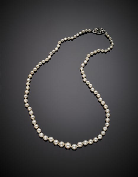 Cultured pearl graduated necklace with white gold green gem clasp, pearl diam from mm 4.15 to mm 8.20 circa, g 21.20 circa, length cm 51 circa.