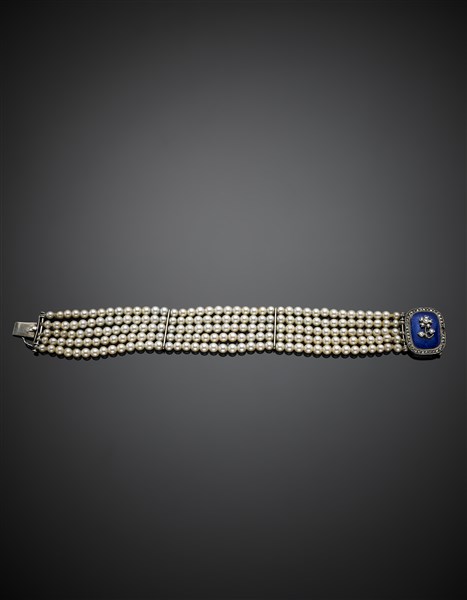 Bracciale a cinque fili di perle coltivate di mm 3.50-4.20 circa, con chiusura in oro bianco, giallo, smalto blu guilloché e piccoli diamanti, distanziatori in oro bianco, g 26,45 circa, lungh. cm 18 circa.